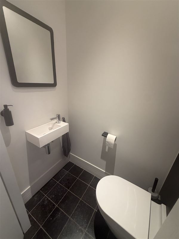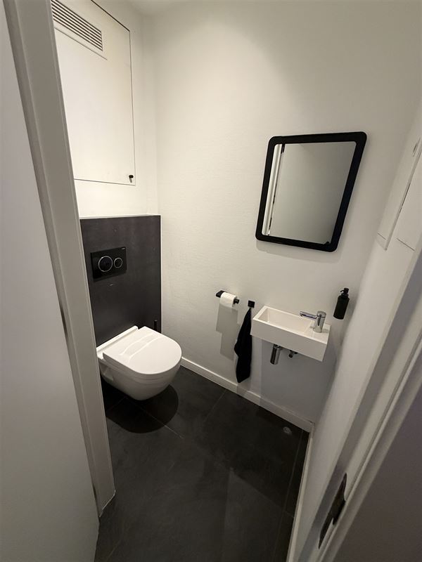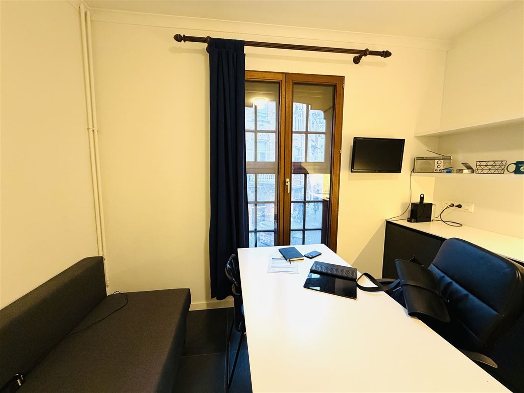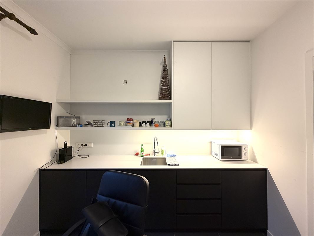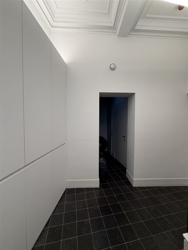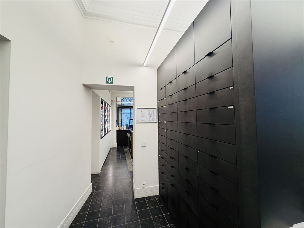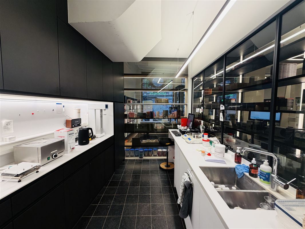 The automated door front leads to a stylish commercial space (+_7,4m x 12m deep) ) with authentic elements and high ceilings with moulures. In the middle right we find a separate room equipped with custom cabinets and water supply (lab) , at the back left a large office space with ceiling high fitted cabinets. There is also a toilet with hand washer , a storage room with water supply and access to a basement that continues under half of the property. There is also an outdoor space/terrace and bicycle storage available. Upstairs we find a separate office/lunch room (15m2)with kitchenette and toilet with hand washer.