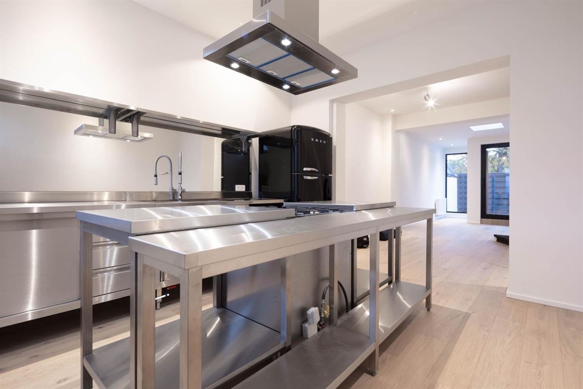La cuisine professionnelle est entièrement équipée, idéale pour cuisiner et organiser des dîners. La salle à manger s'intègre parfaitement dans le salon, qui s'ouvre sur une terrasse privée de 20 m2 par une grande fenêtre coulissante. Des escaliers mènent au sous-sol avec une salle de chauffage central et un espace de stockage supplémentaire.