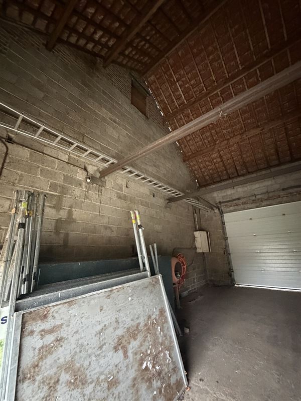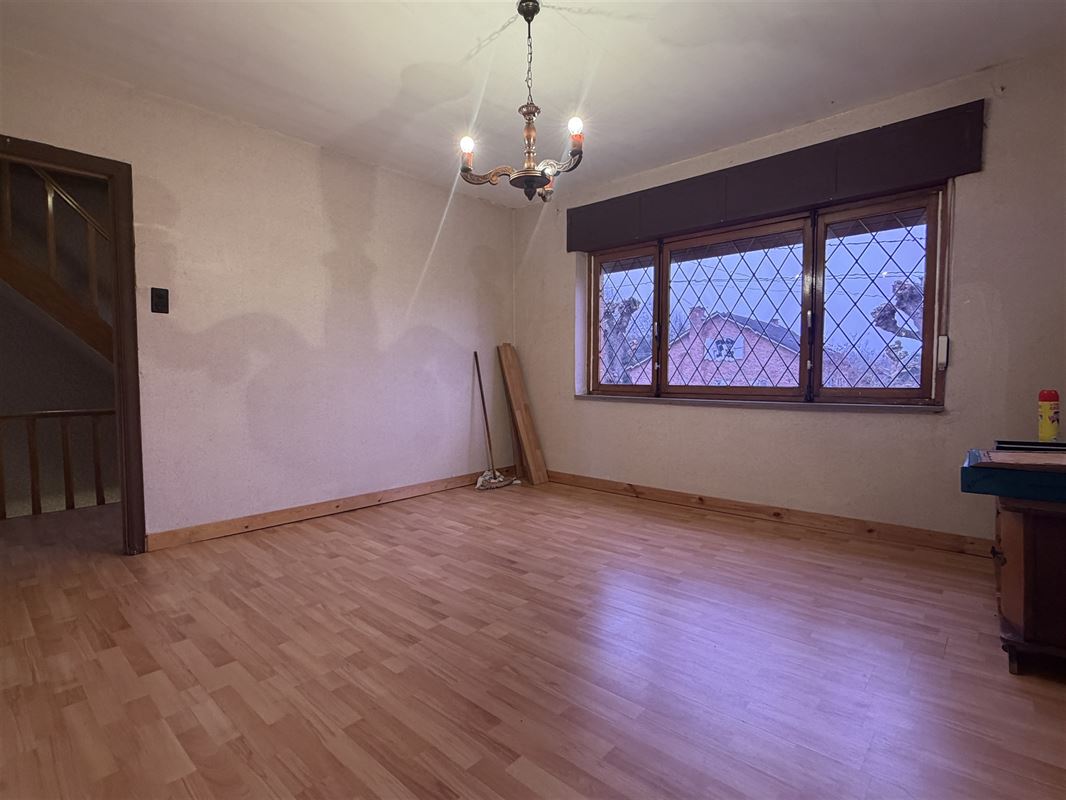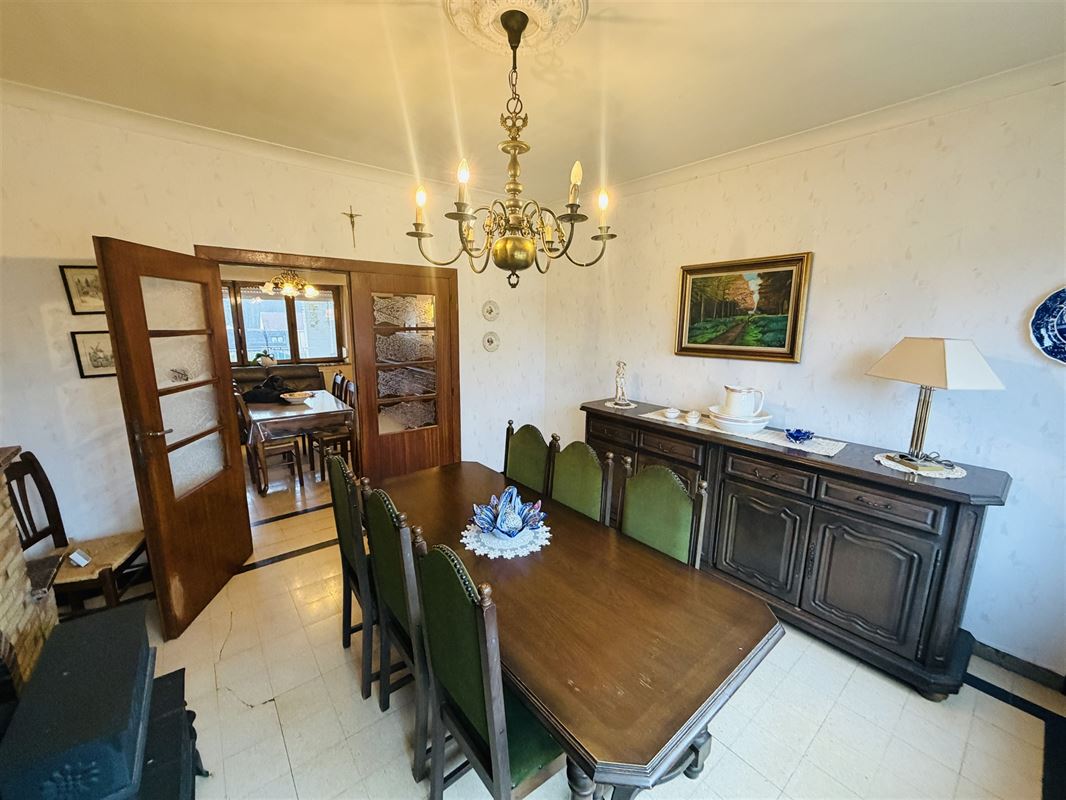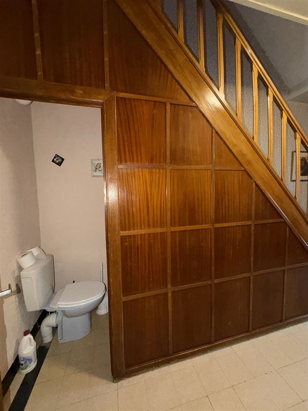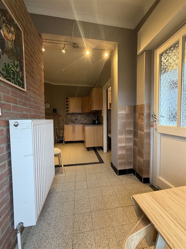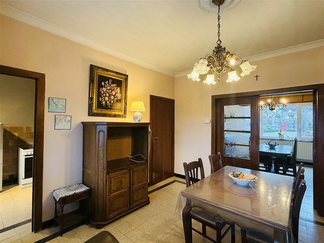 De woning is ingedeeld als volgt : een ruime inkomhal met onder de trap een toilet , een voorkamer (was apart toegankeljik via een nu dichtgemaakte deur), een eetkamer met zicht op veranda en tuin. Vanuit deze eetkamer was er vroeger een deur naar de naastgelegen garage. Rechts van de eetkamer een compacte keuken ( geïnstalleerd) , een kleine badkamer met lavabo en douche. Deze achterbouw geeft ook toegang naar het overdekt terras en de (lager gelegen) tuin. De tuin is zeer diep en heeft een zuid-oost oriëntatie. De woning is volledig onderkelderd (droge kelder) hier vinden we de mazoutinstallatie en andere bergkelders. Vanuit de kelder was er tevens een toegang naar de naastgelegen zeer ruime (40m2) en zeer hoge garage (of atelier). Deze garage heeft een hoge poort voor- en achteraan waardoor toegang met bestelwagen of traktor en doorrit naar de tuin mogelijk is.