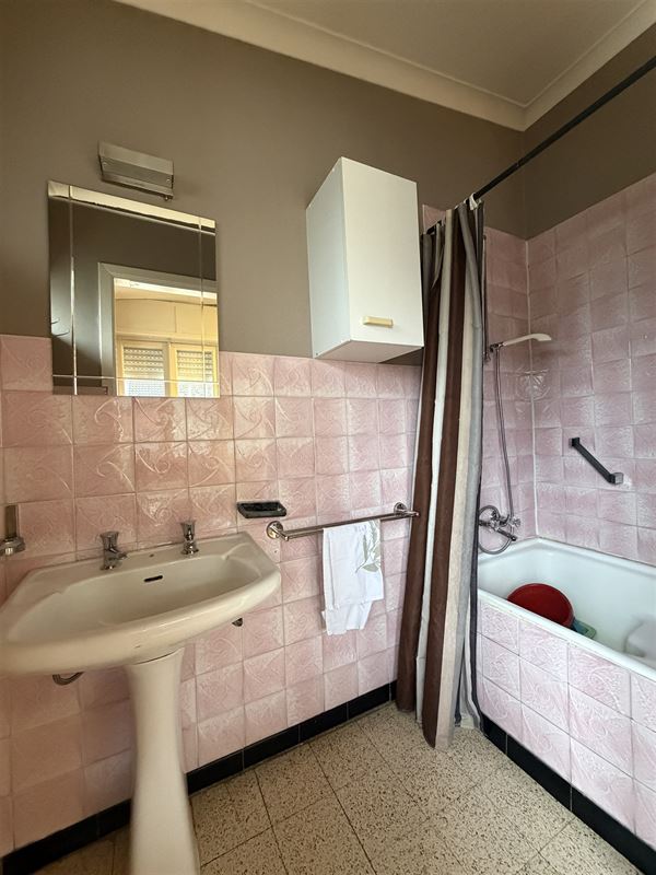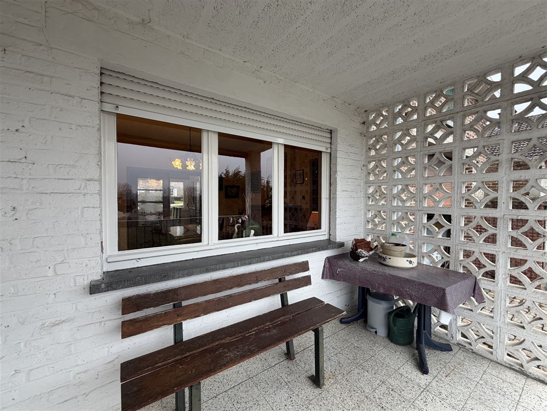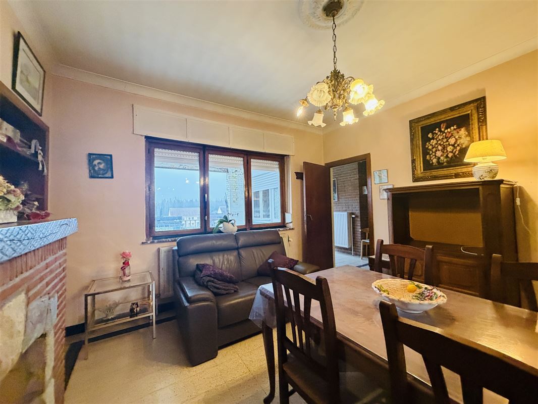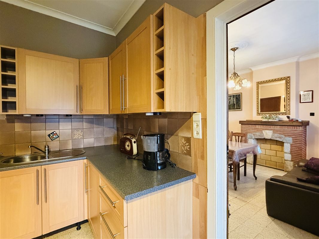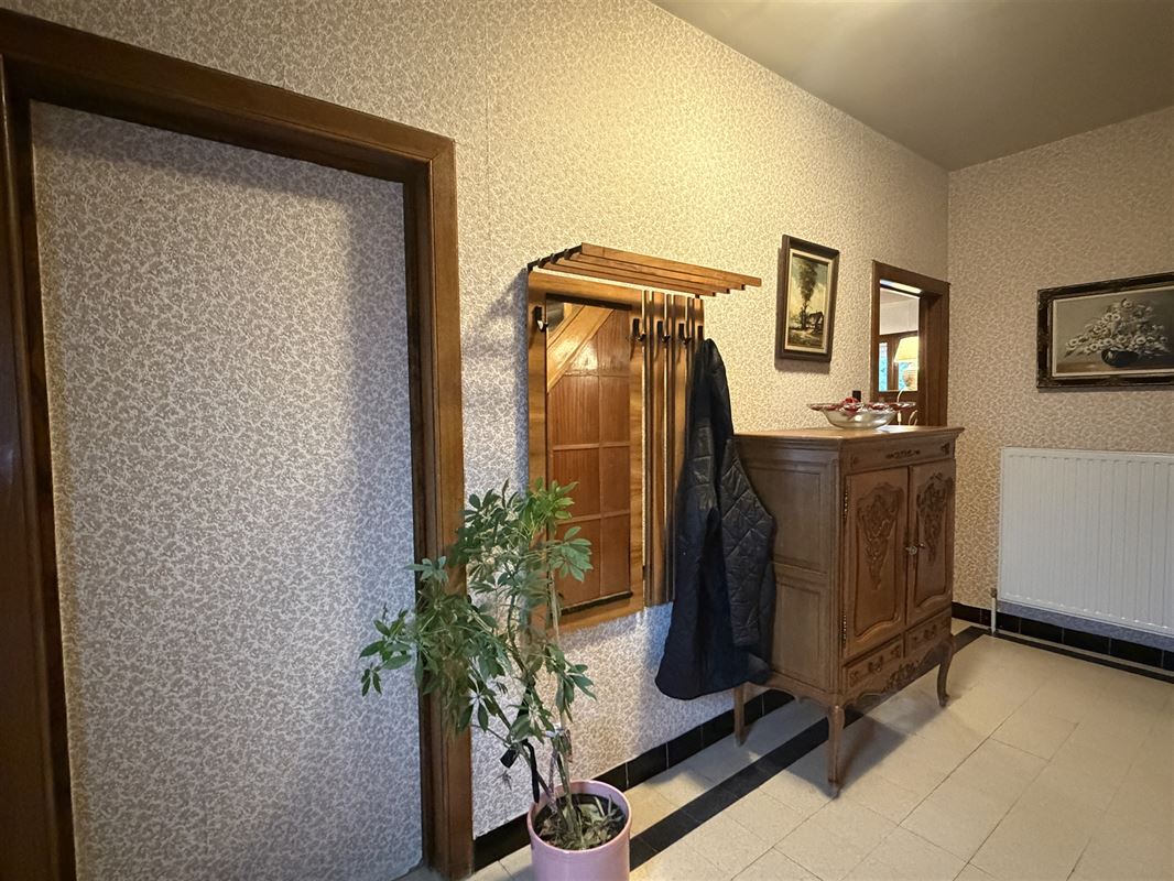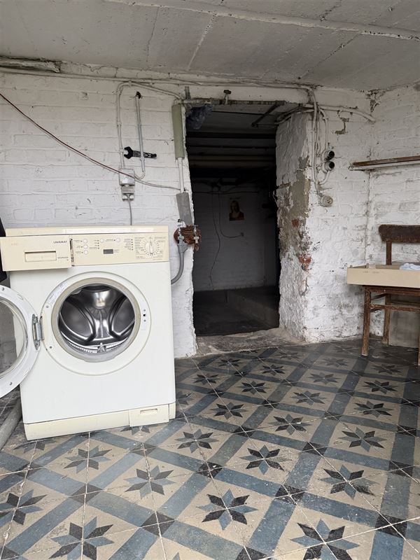 De woning is ingedeeld als volgt : een ruime inkomhal met onder de trap een toilet , een voorkamer (was apart toegankeljik via een nu dichtgemaakte deur), een eetkamer met zicht op veranda en tuin. Vanuit deze eetkamer was er vroeger een deur naar de naastgelegen garage. Rechts van de eetkamer een compacte keuken ( geïnstalleerd) , een kleine badkamer met lavabo en douche. Deze achterbouw geeft ook toegang naar het overdekt terras en de (lager gelegen) tuin. De tuin is zeer diep en heeft een zuid-oost oriëntatie. De woning is volledig onderkelderd (droge kelder) hier vinden we de mazoutinstallatie en andere bergkelders. Vanuit de kelder was er tevens een toegang naar de naastgelegen zeer ruime (40m2) en zeer hoge garage (of atelier). Deze garage heeft een hoge poort voor- en achteraan waardoor toegang met bestelwagen of traktor en doorrit naar de tuin mogelijk is.