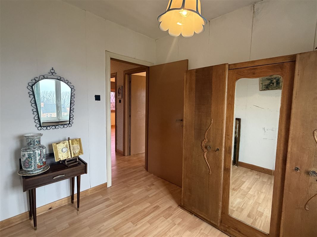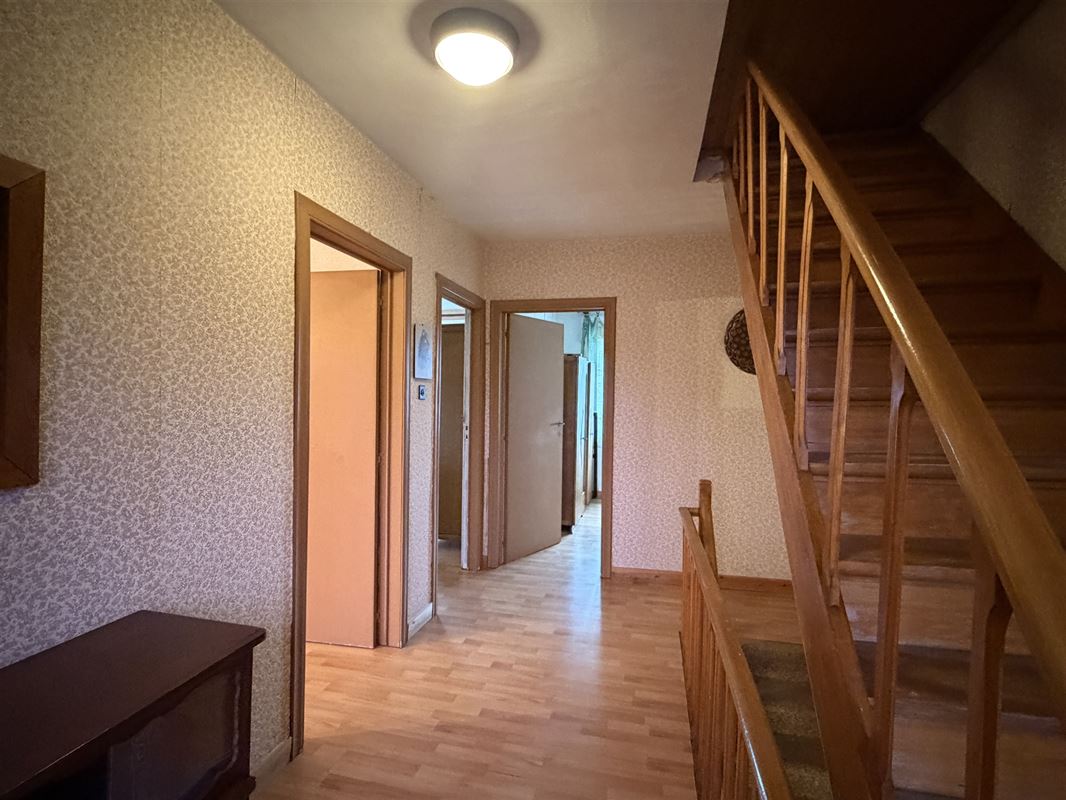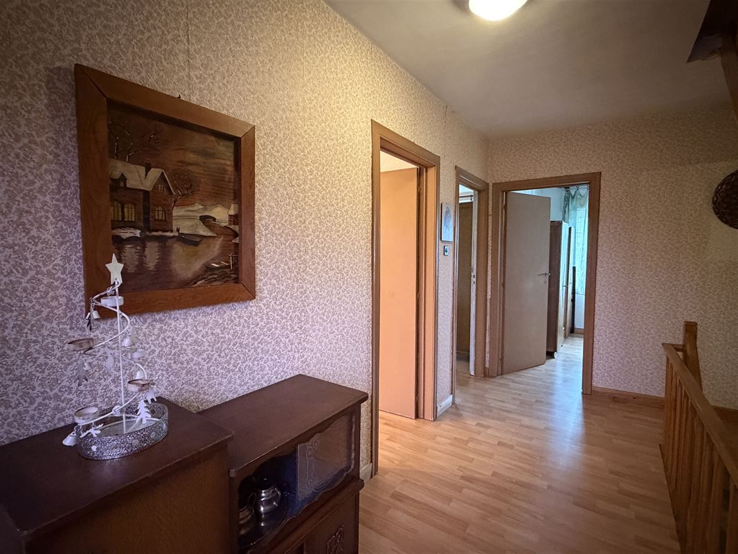 Vanuit de inkomhal leidt een houten trap naar de verdieping waar we 3 slaapkamers vinden ( twee zeer ruime kamers van elk 16m2 + een kleinere kamer van 7,25m2)